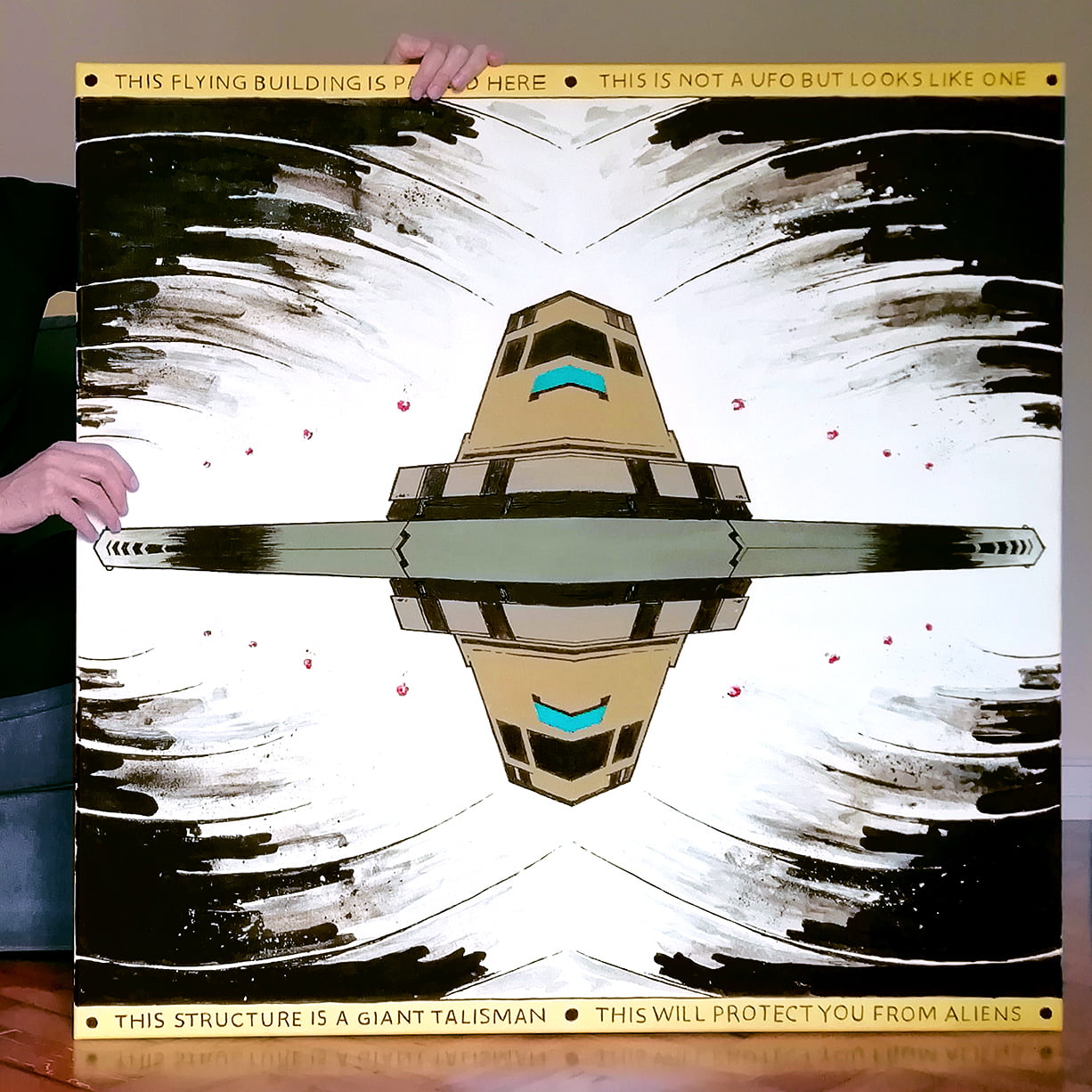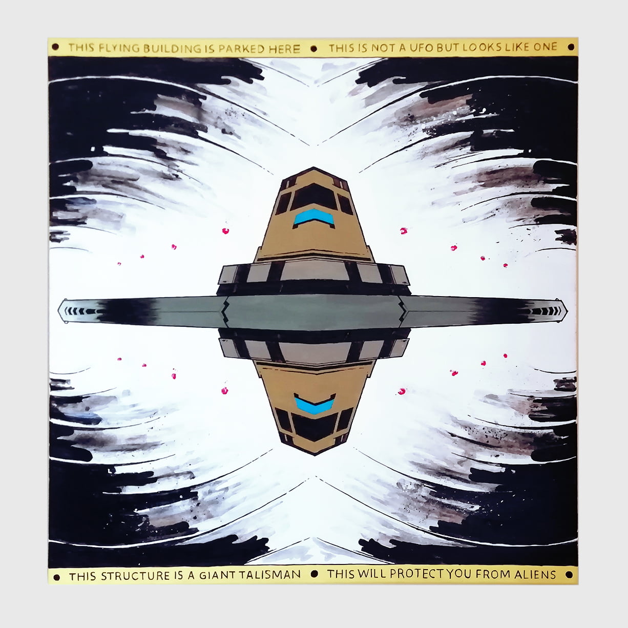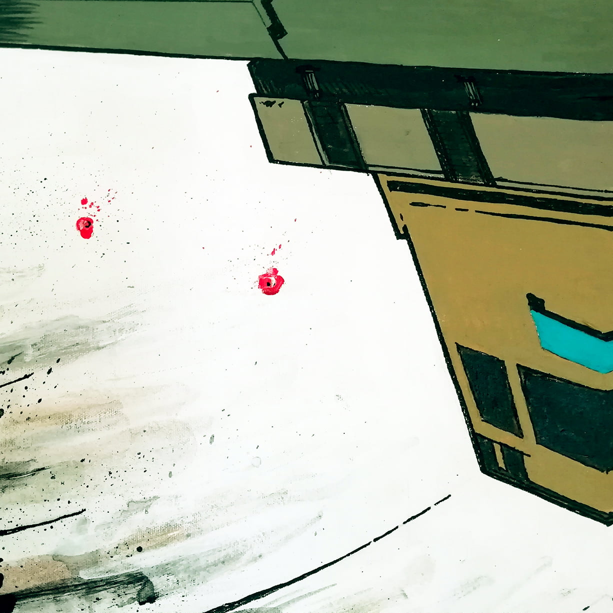 The stylized mode he picture the landscape and architectural structures is often abstract and dark, but the way he uses the canvas as a comics square gives it a certain pop joy that makes his painting both disconcerting and stimulating.