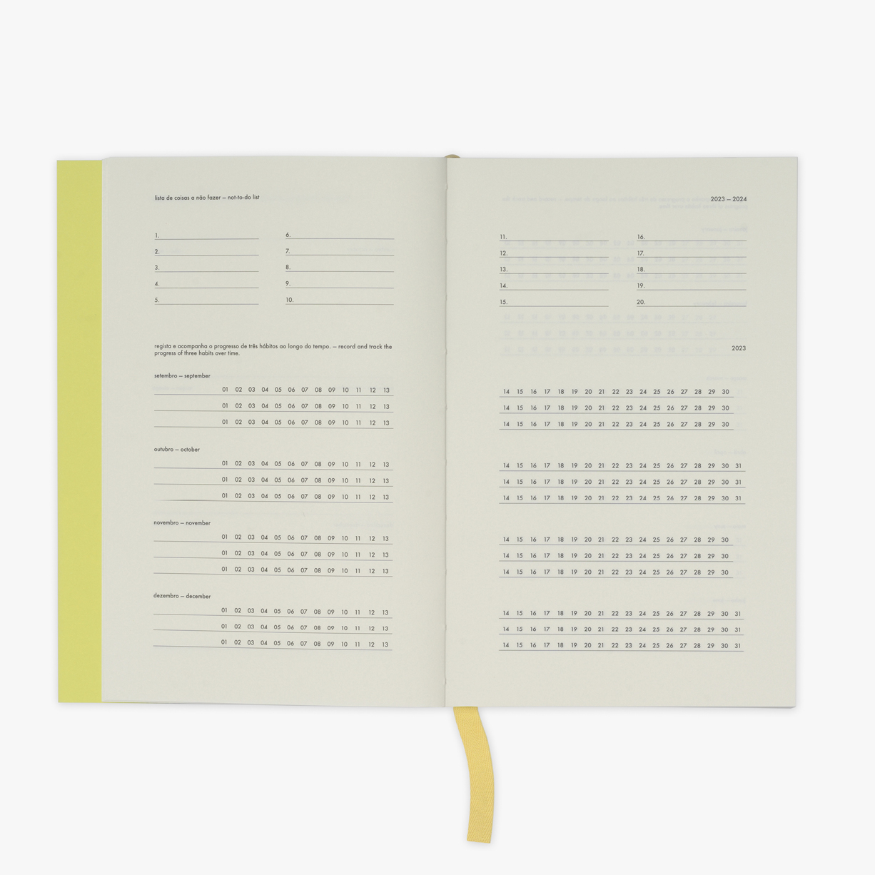 Capa em papel de 260g com estampagem amarela.